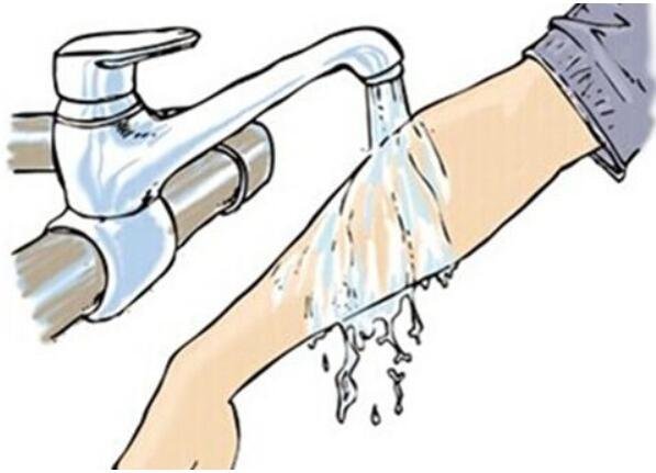 应立即脱去沾染化学品的衣物,迅速用大量清水长时间冲洗,避免扩大烧伤面。烧伤面较小时,可先用冷水冲洗3 0分钟左右,再涂抹烧伤膏;当烧伤面积较大时,可用冷水浸湿的干净衣物(或纱布、毛巾、被单)敷在创面上,然后就医。处理时,应尽可能保持水疱皮的完整性,不要撕去受损的皮肤,切勿涂抹有色药物或其它物质(如红汞、龙胆紫、酱油、牙膏等),以免影响对创面深度的判断和处理。